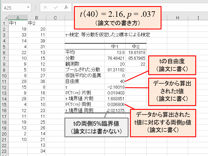上の例では両側検定なので,「P(T<=t)両側」が有意水準より小さければ有意差ありです。論文では,両側検定の場合,t値のマイナスは省略して書くことが多いです。数値は適切な桁数に四捨五入して書きましょう。